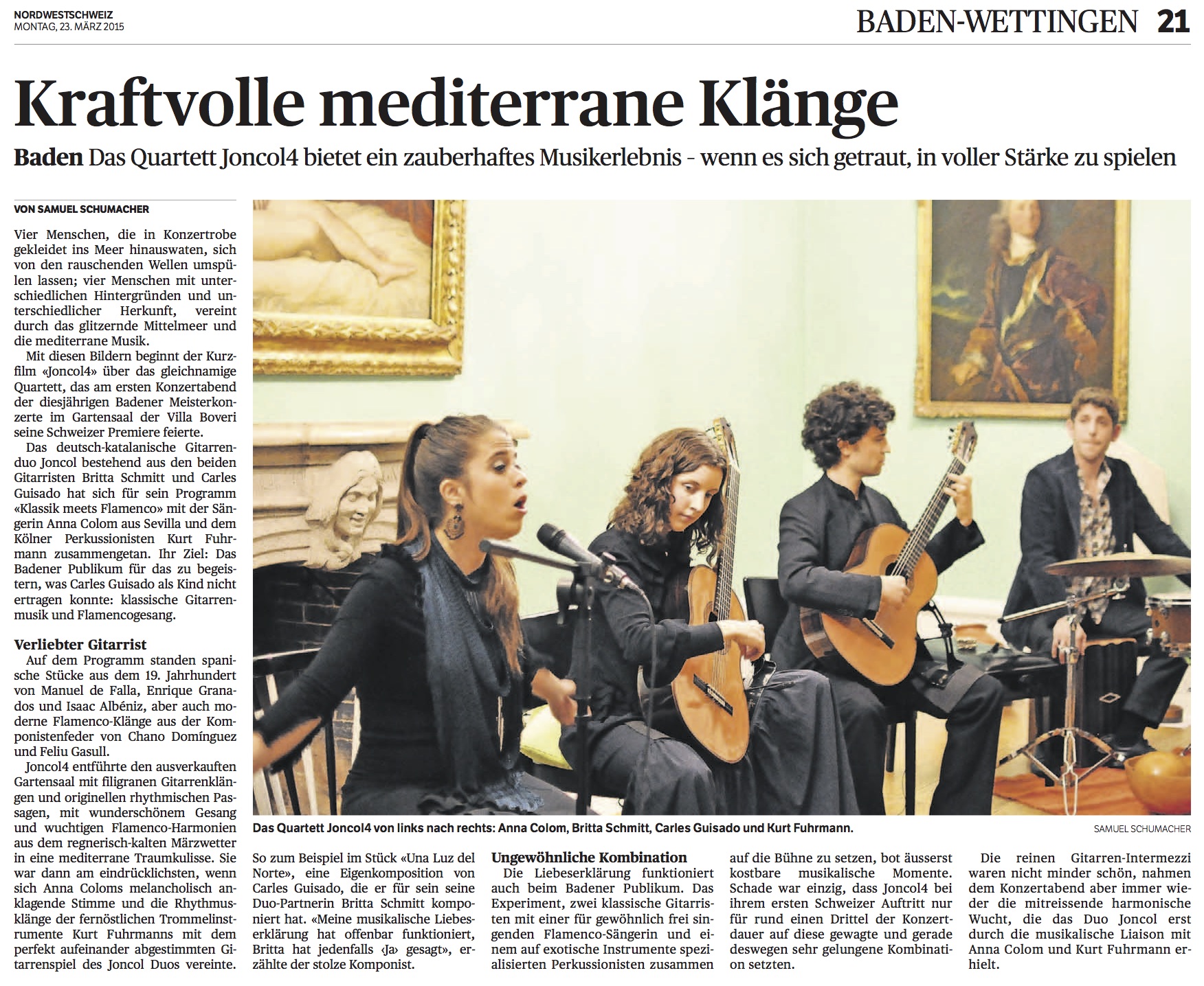 «Joncol4 entführte den ausverkauften Gartensaal mit filigranen Gitarrenklängen und originellen rhythmischen Passagen, mit wunderschönem Gesang und wuchtigen Flamenco-Harmonien aus dem regnerisch-kalten Märzwetter in eine mediterrane Traumkulisse. Sie war dann am eindrücklichsten, wenn sich Anna Coloms melancholisch anklagende Stimme und die Rhythmusklänge der fernöstlichen Trommelinstrumente Kurt Fuhrmanns mit dem perfekt aufeinander abgestimmten Gitarrenspiel des Joncol Duos vereinte. So zum Beispiel im Stück ‹Una Luz del Norte›, einer Eigenkomposition von Carles Guisado.»