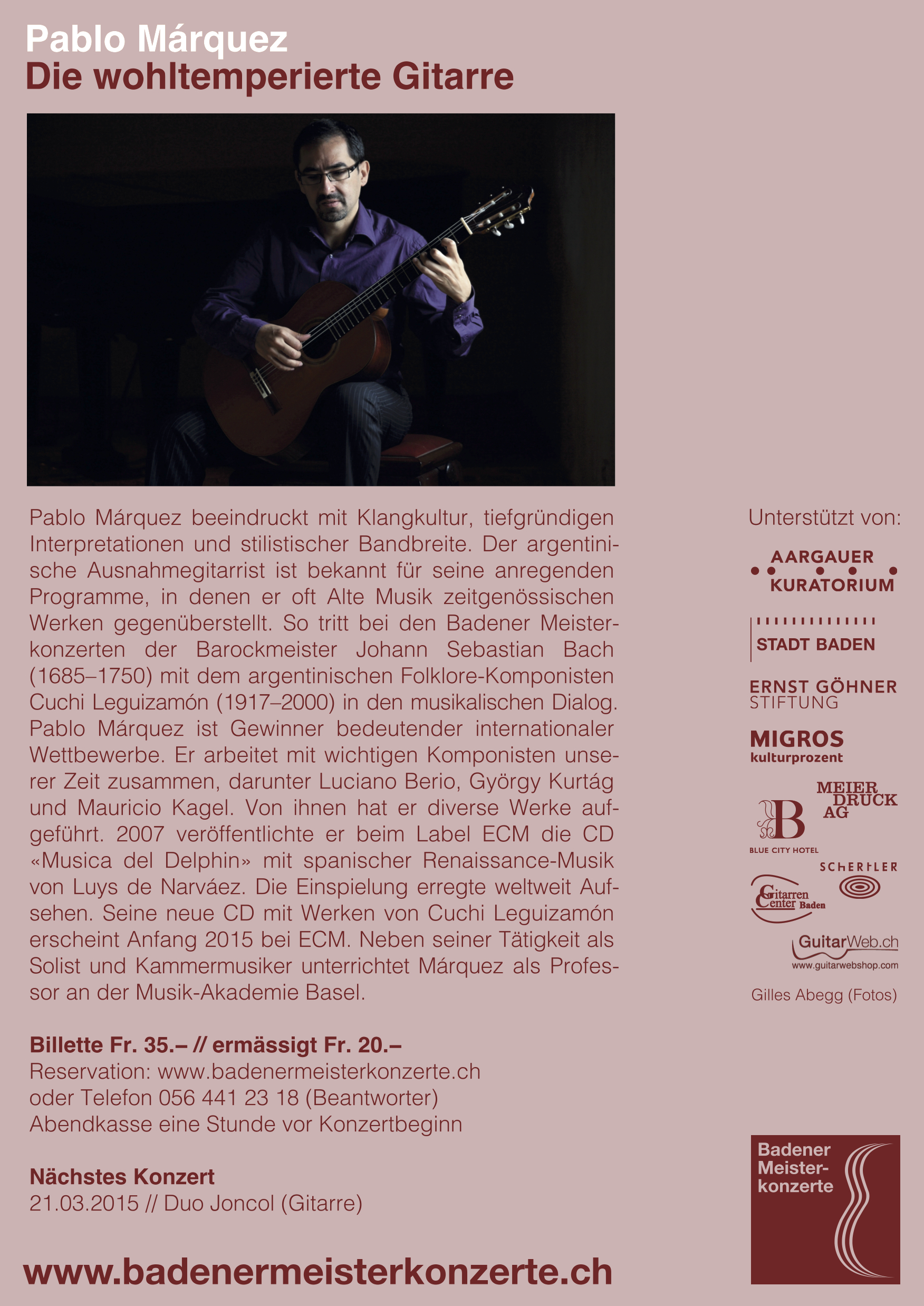 Meisterhaft war nicht nur das Spiel des Ausnahmegitarristen, sondern auch seine vielschichtigen Arrangements der Musik Leguizamóns. Mit seinem begeisternden Auftritt machte er beste Werbung für seine neue CD «El Cuchi bien temperado», die er in Baden erstmals einem europäischen Publikum präsentierte und die Anfang 2015 beim renommierten Label ECM erscheint. Die Besucher nutzen die Gelegenheit denn auch rege, am Konzert bereits vorab ein Exemplar zu erstehen.